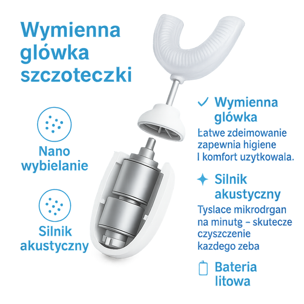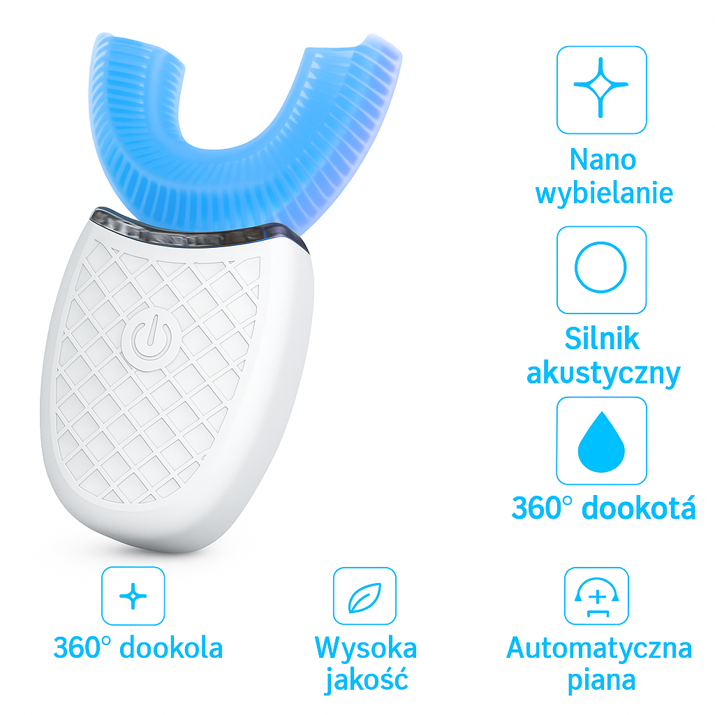 ✔️ Ergonomiczny kształt litery U – idealnie dopasowuje się do kształtu szczęki, umożliwiając jednoczesne czyszczenie wszystkich zębów bez wysiłku.